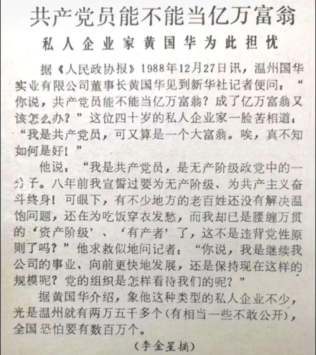 问题是大量党员发家致富,根本就不可能将他们开除出党。今天,关于企业家入党的问题,不是企业家该不该入党,而是大量的党员成为了企业家,造成了事实上的企业家党员。难不成把他们都开除不成?
